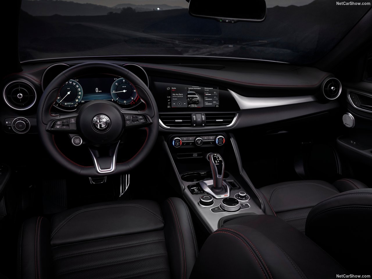 הג’וליה מציעה סביבת נהג ממוקדת: הגה עבה עם כפתור התנעה אדום, לוח מחוונים אנלוגי־דיגיטלי ברור, ומסך מולטימדיה של 8.8 אינץ’ עם קישוריות Apple CarPlay ו־Android Auto.