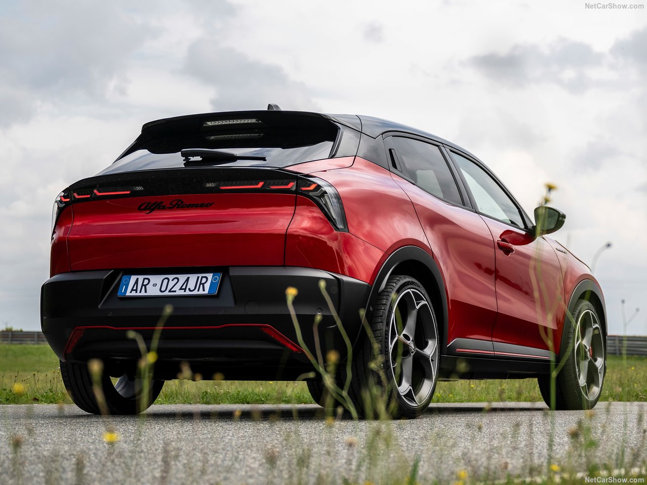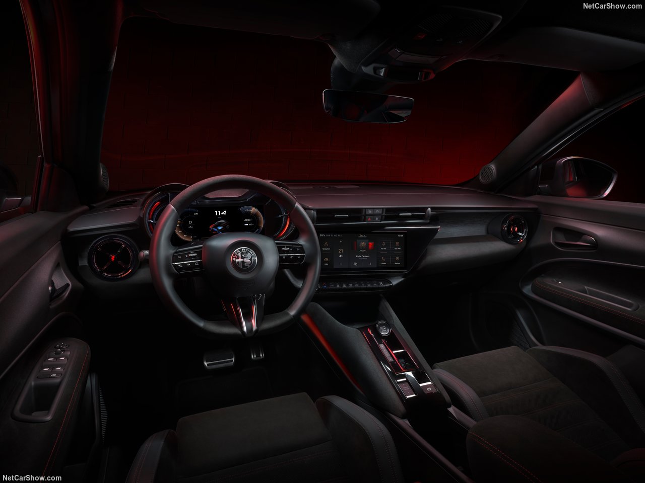 מבחוץ, הג’וניור שומר על שפה עיצובית ייחודית: יחידות תאורה קדמיות בחתימת “3+3” המזוהה עם דגמי המותג, גריל קדמי בצורת ה”סקודטו” המשולש, וקווים נקיים אך עם נפחיות בולטת בכנפיים. פרופיל הצד מציג ידיות אחוריות נסתרות במסגרת החלון, קו גג משתפל בסגנון קופה, וחישוקי 18–20 אינץ’ בעיצובים ייחודיים. מאחור, פס תאורה רוחבי מודגש, ספוילר קטן, ופרטים שמזכירים מעט את הג’וליה והסטלויו.